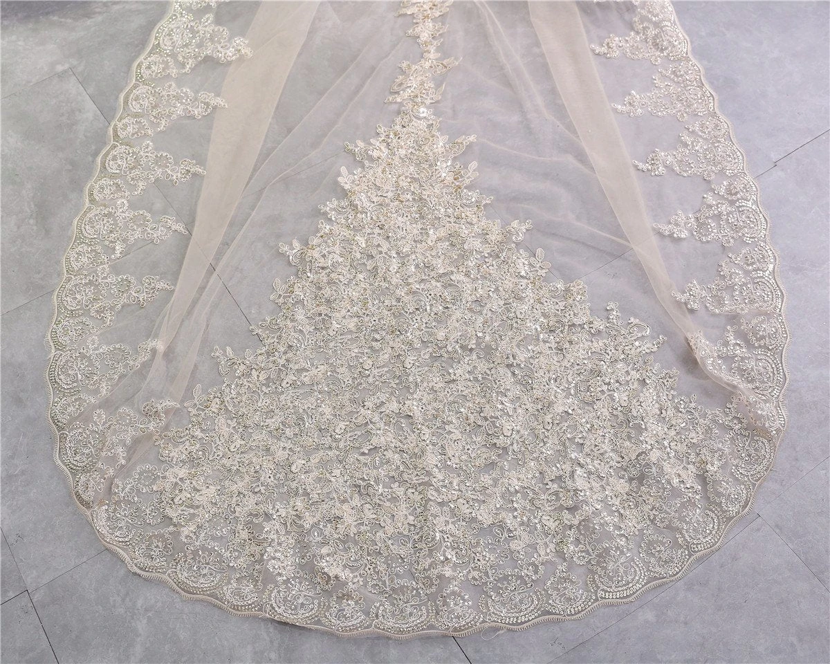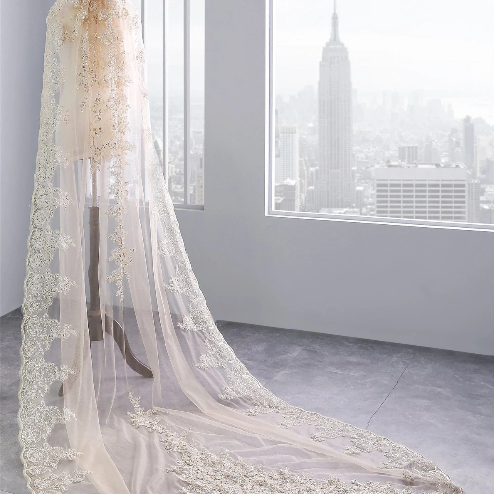 One-Tier Wedding Veil UK Lace Edge Tulle Cathedral Veils Sequin Appliques TS9009