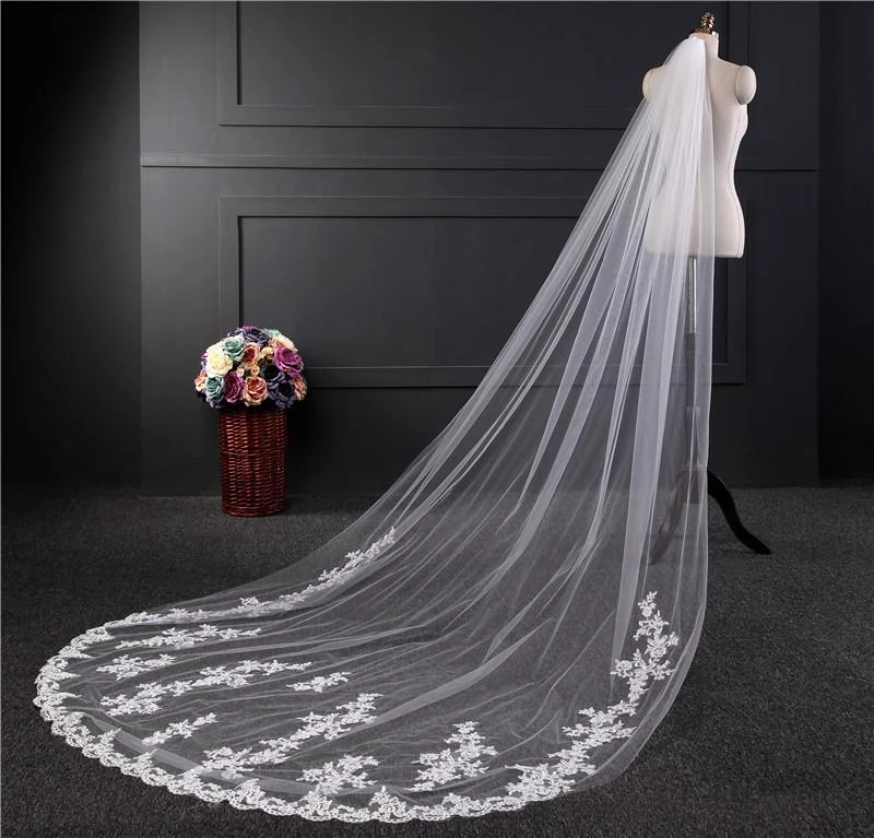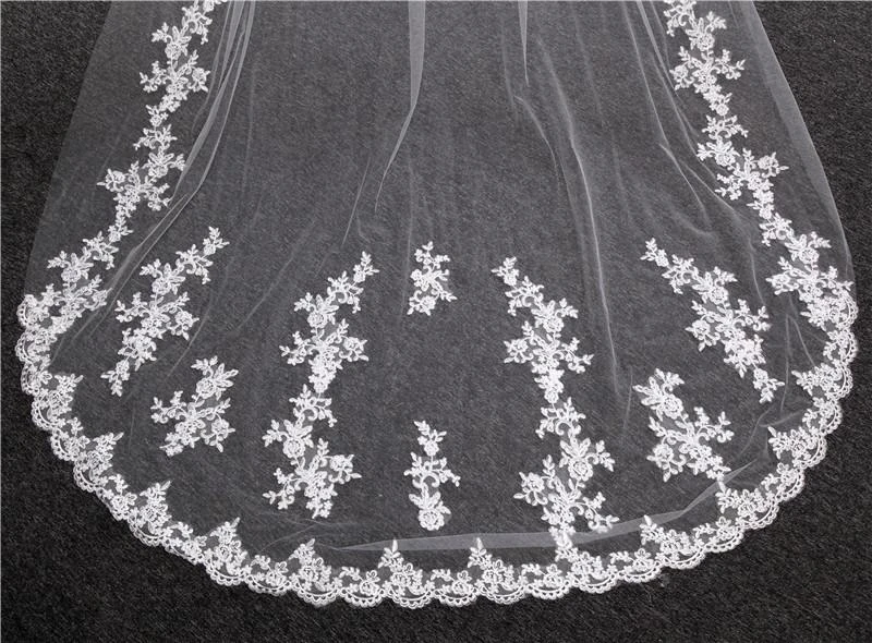 One-Tier Wedding Veil UK Tulle Lace Edge Chapel Veils Appliques TS91039