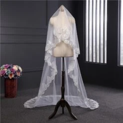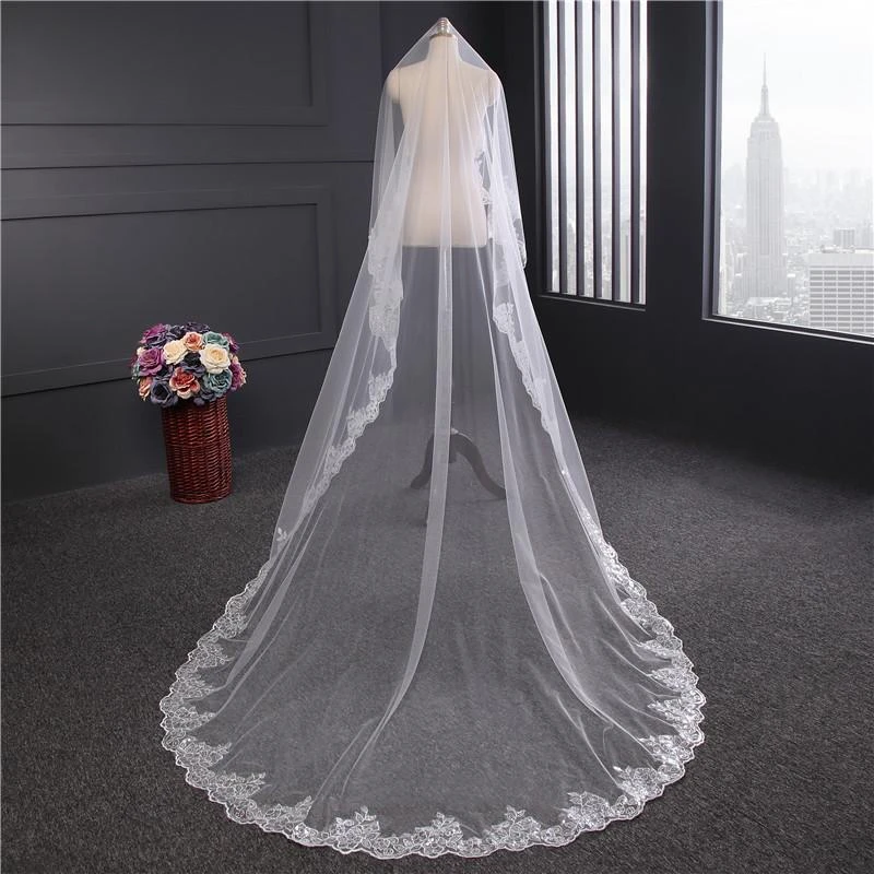 One-Tier Wedding Veil UK Tulle Lace Edge Chapel Veils Sequins Appliques TS91048