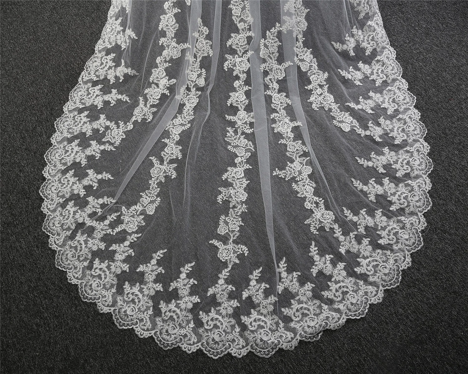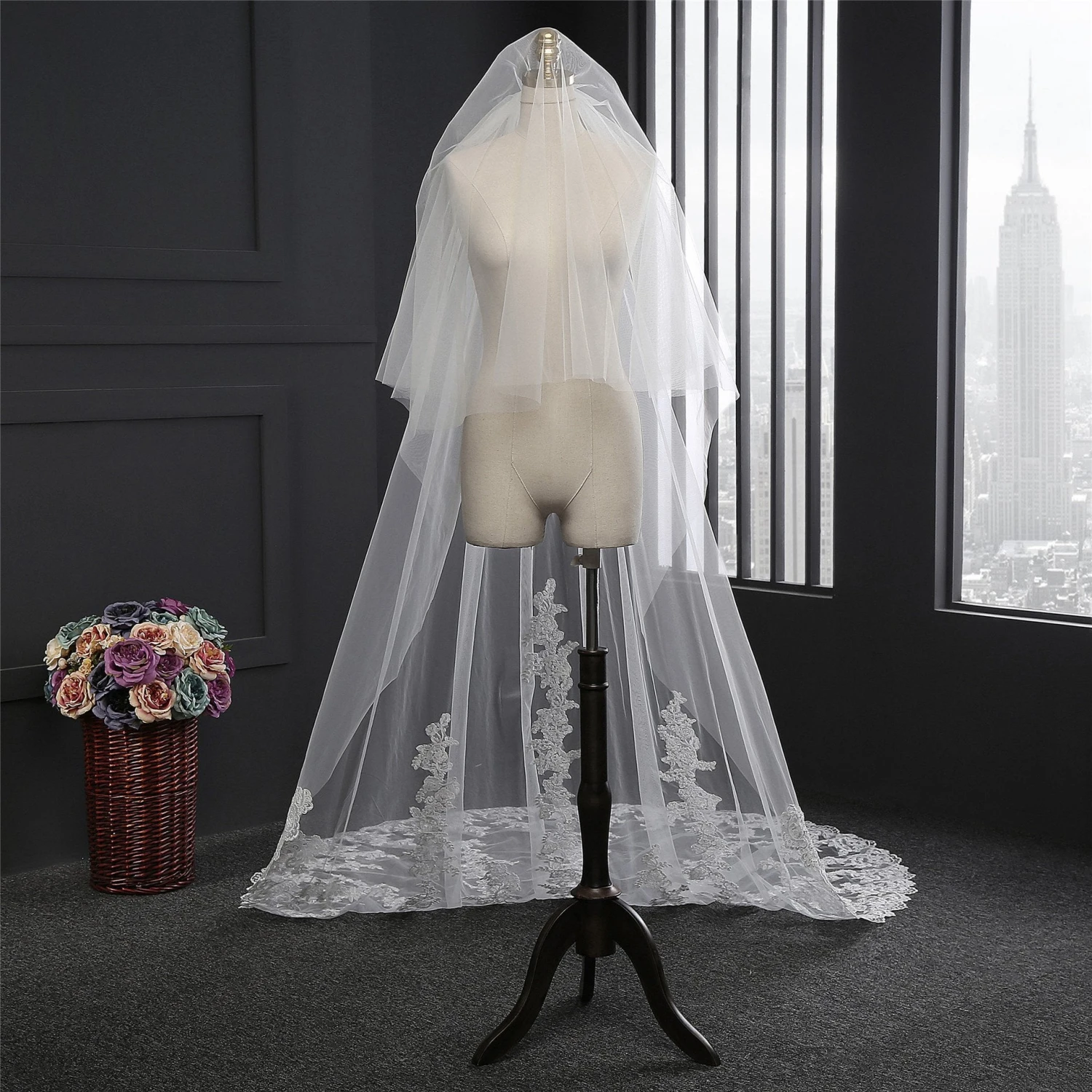 Two-Tier Wedding Veil UK Lace Edge Tulle Cathedral Veils Appliques TS9005