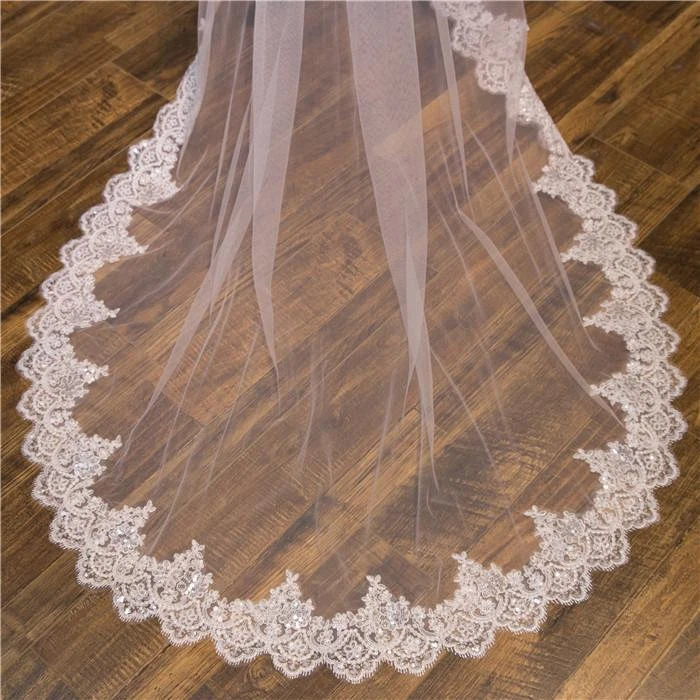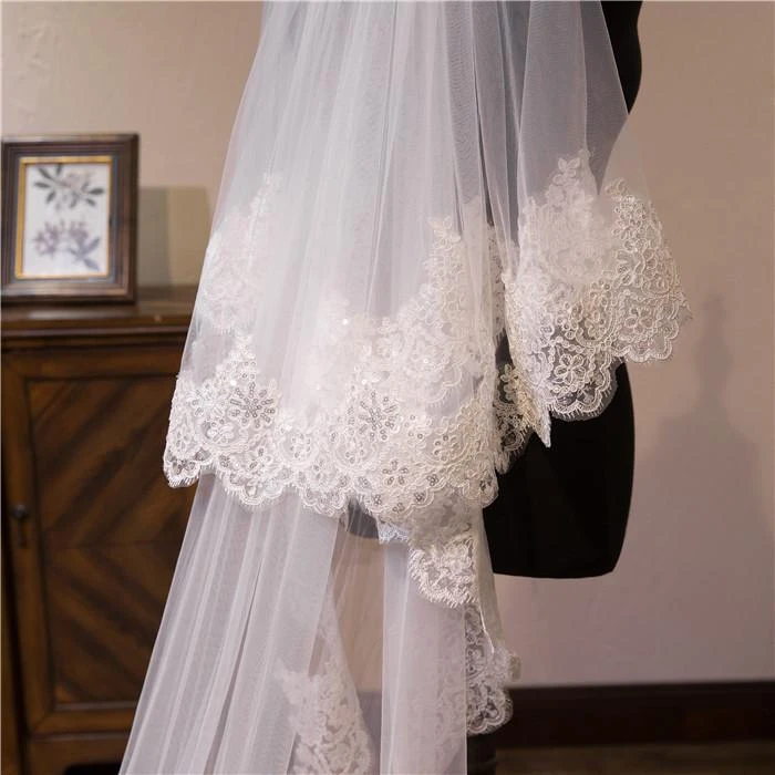 Two-Tier Wedding Veil UK Tulle Lace Edge Chapel Veils Appliques TS91009