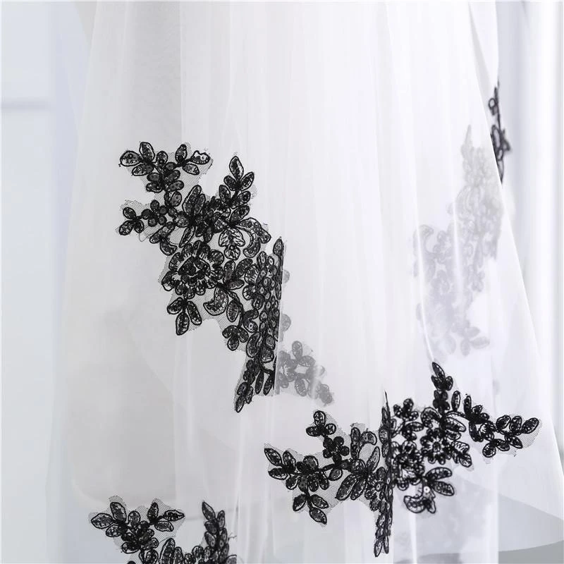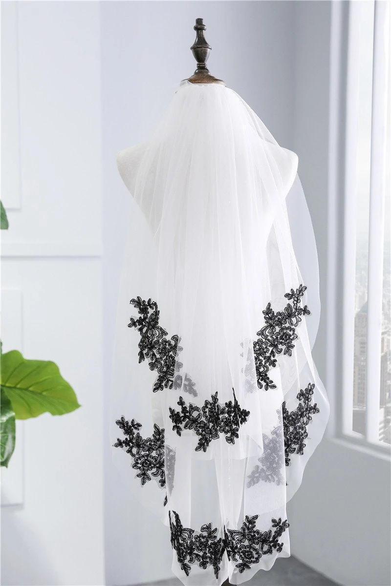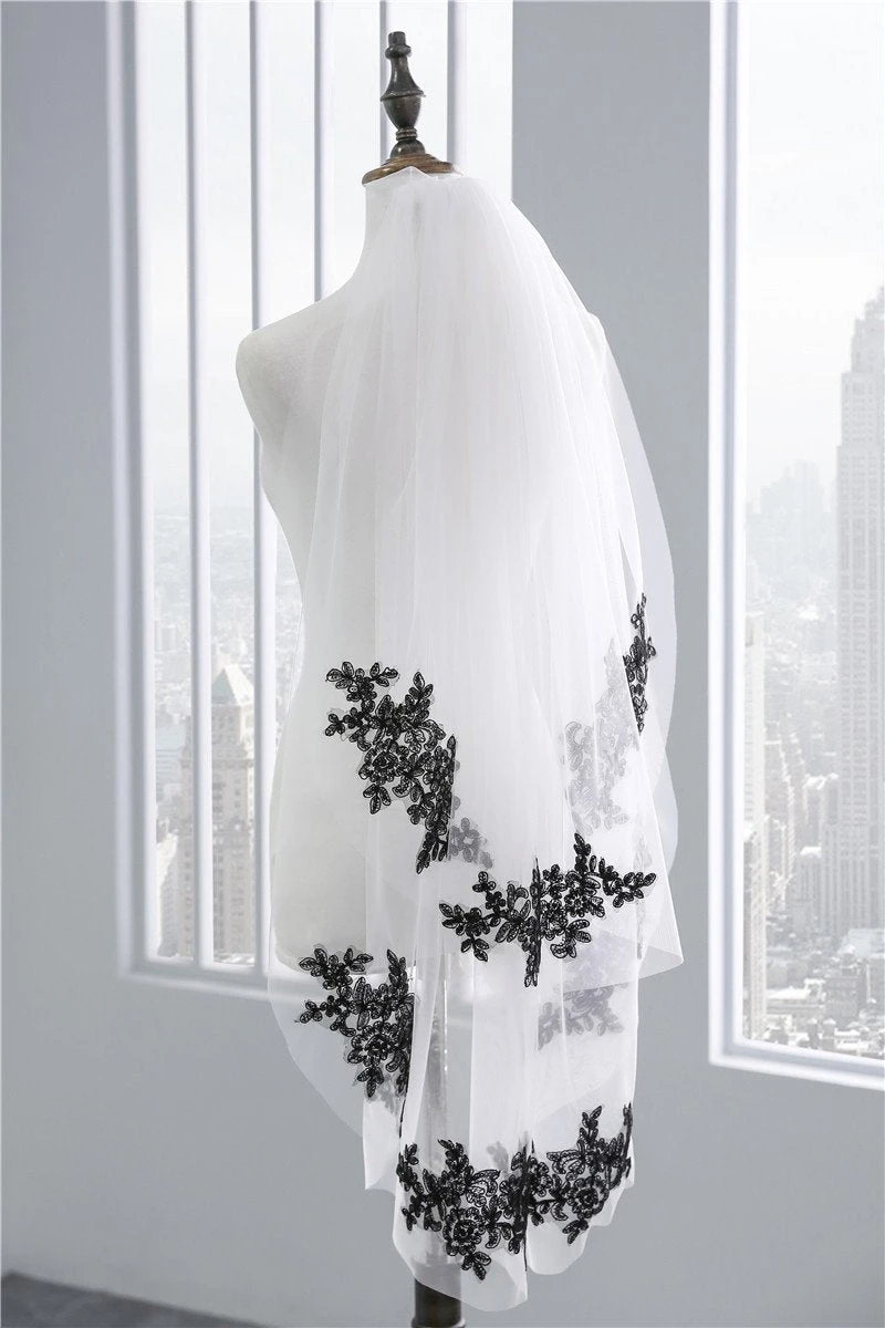 Two-Tier Wedding Veil UK Tulle Lace Edge Elbow Bridal Veils Black Appliques TS91008